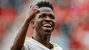 Dedicou? Vini Jr. marcou um gol durante o jogo deste sábado (04), com Virginia assistindo no estádio, e mandou um beijo para a câmera.