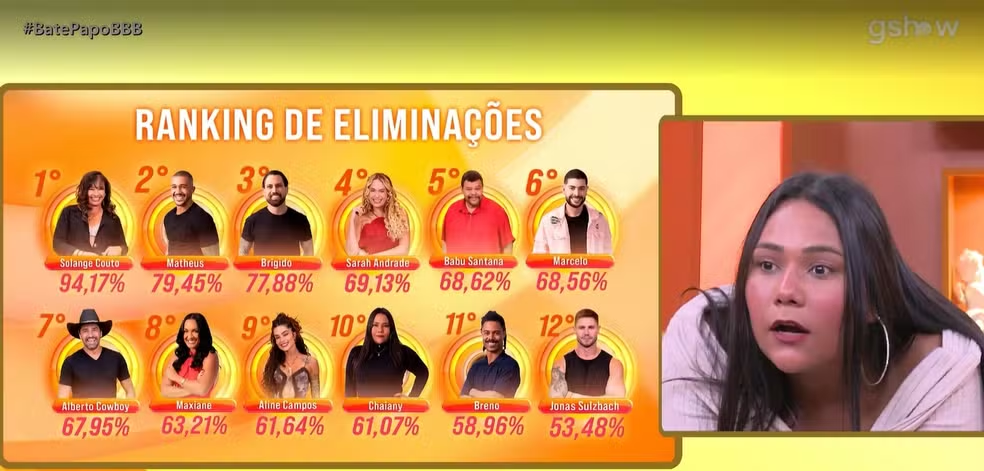 Em seguida, Chaiany analisou o restante das porcentagens dos demais ex-participantes do reality. Confira o momento viralizado nas redes sociais: