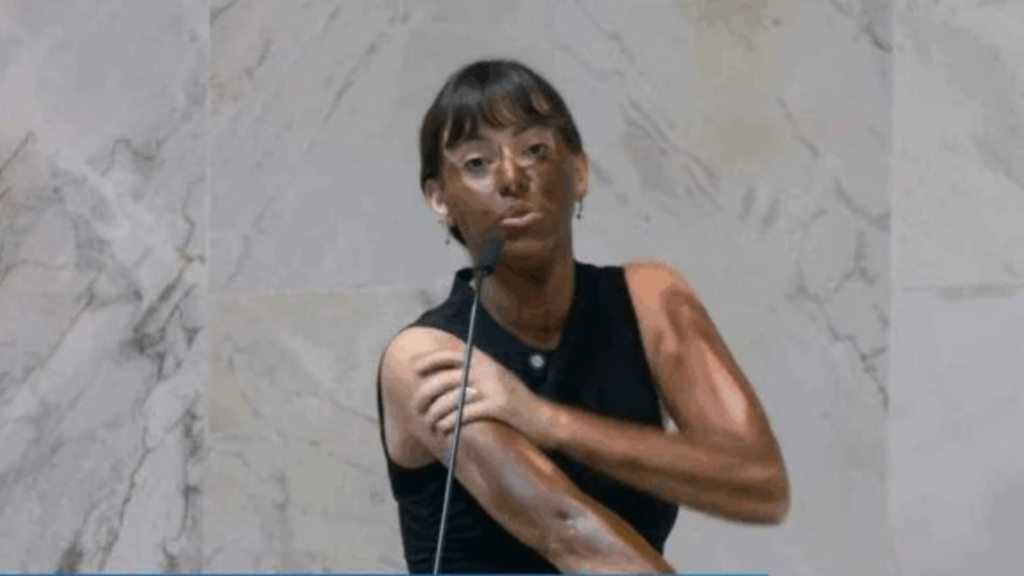 Durante um discurso em plenário, a parlamentar utilizou maquiagem para escurecer o tom da pele e afirmou que se tratava de um “experimento social”. Na fala, ela questionou se a mudança de aparência permitiria vivenciar as experiências de pessoas negras. “Eu tô negra agora?”, disse.