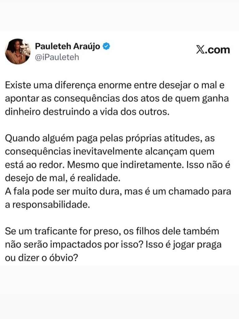 “Existe uma diferença enorme entre desejar o mal e apontar as consequências dos atos de quem ganha dinheiro destruindo a vida dos outros”, diz o post. Confira:
